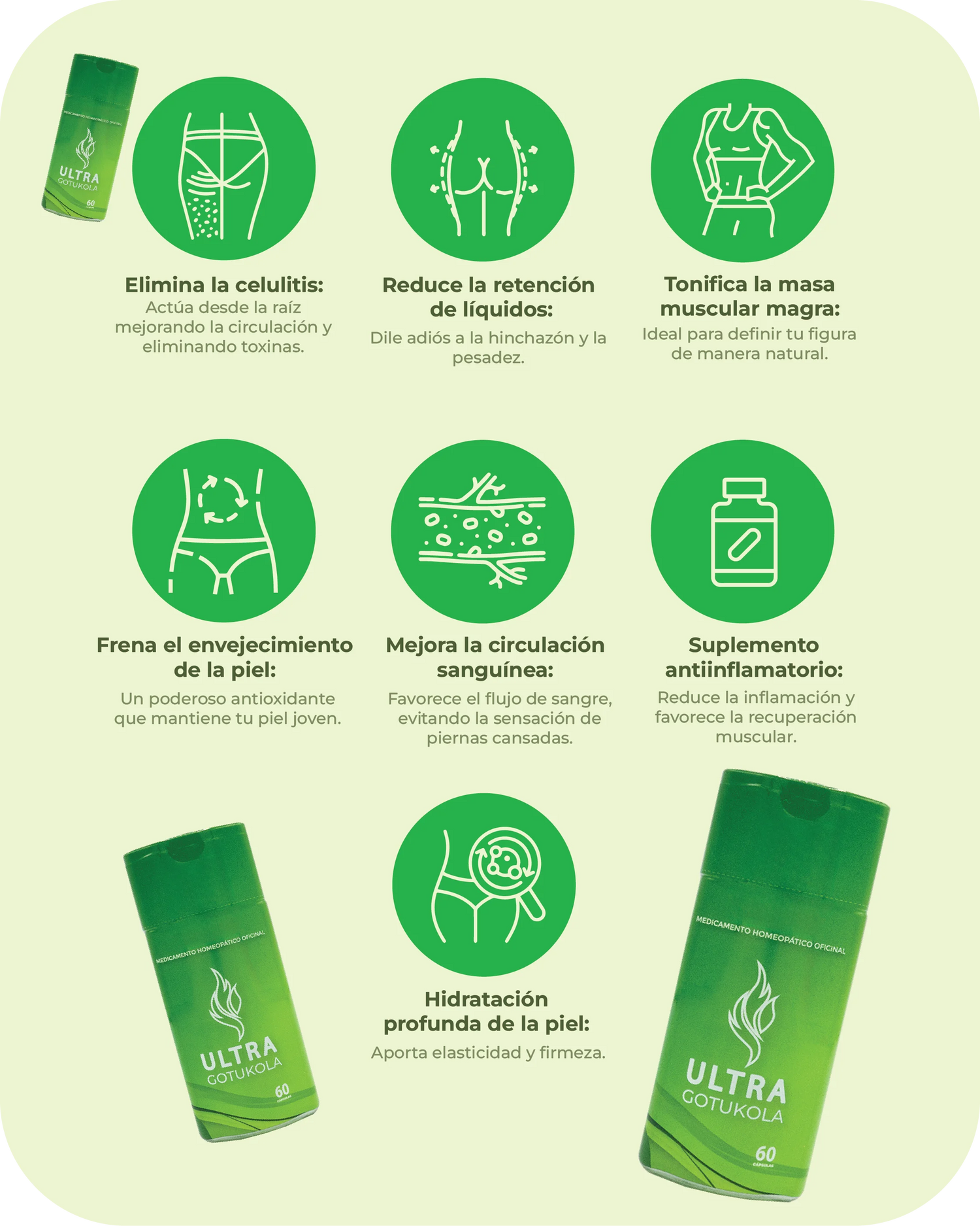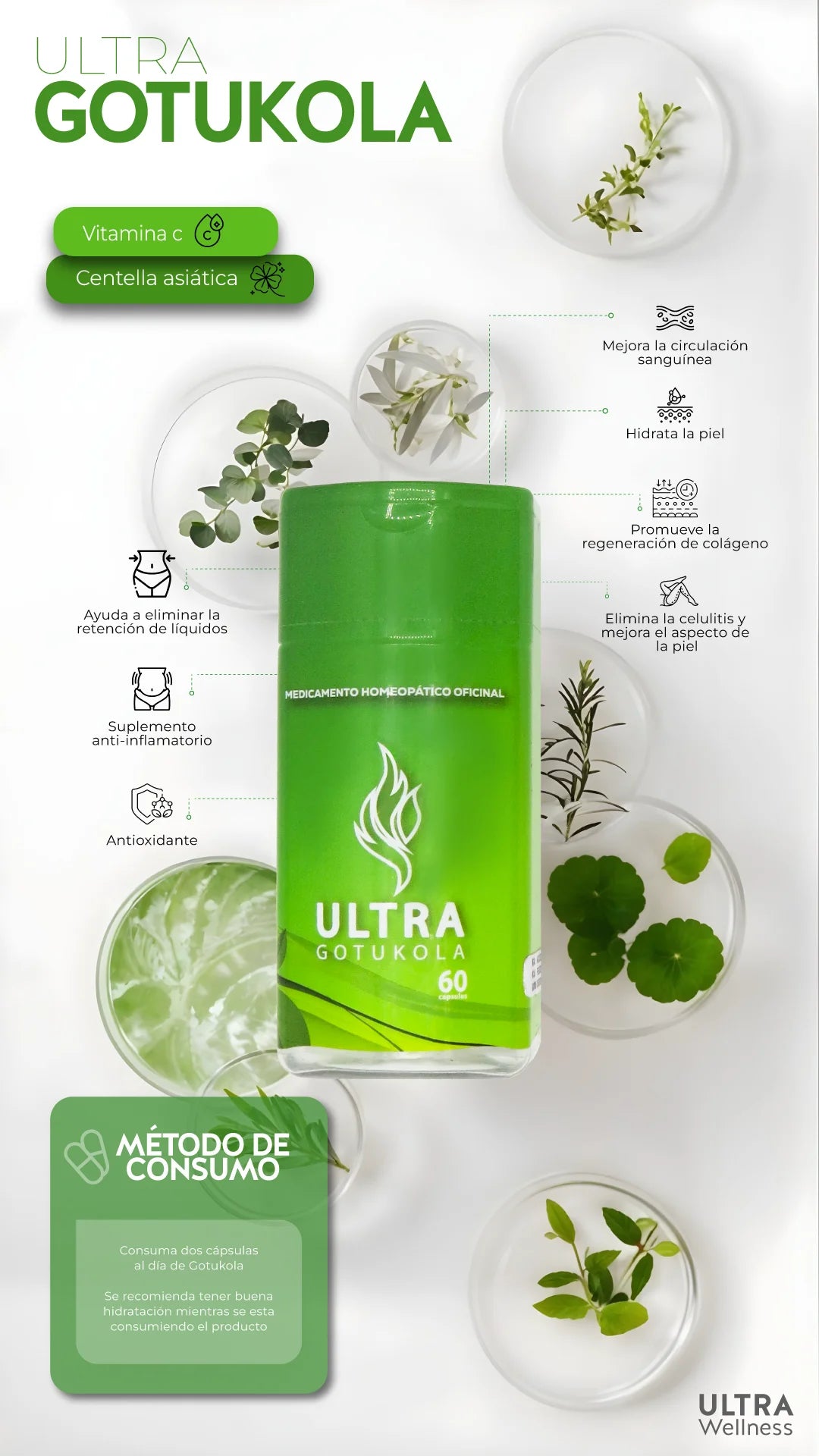 ¿Cansada de la celulitis y la retención de líquidos? Ultra Gotukola es un suplemento natural a base de Centella Asiática, diseñado para mejorar la circulación, eliminar toxinas y reafirmar tu piel desde adentro.