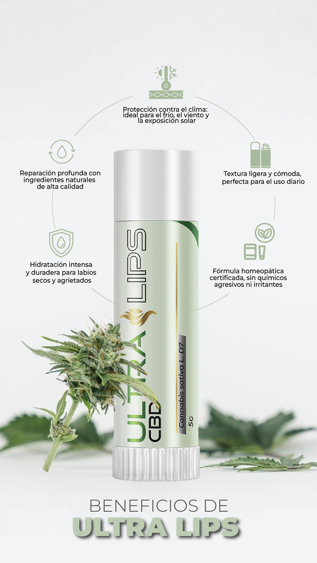 Ultra Lips es un bálsamo homeopático desarrollado con Саnnаbіs Sativa L. D7, un ingrediente con propiedades regenerativas, antioxidantes y calmantes que protege y repara los labios.